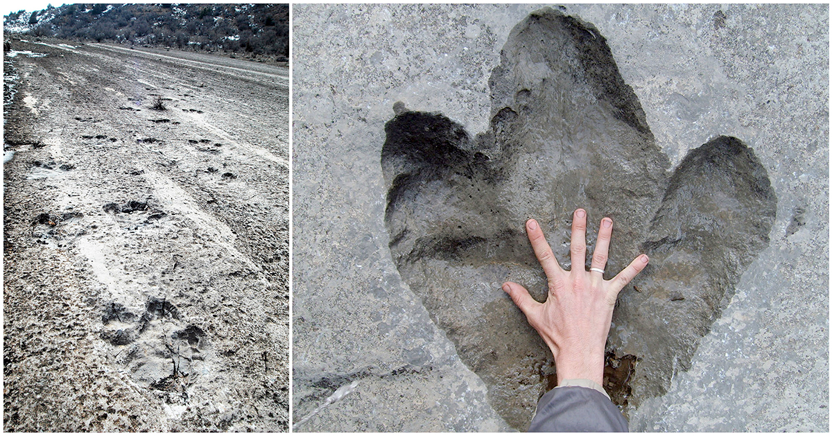 Небольшой участок плато буквально «истоптан» цепочками огромных трехпалых следов размерами от 20 до 70 см. Здесь на наклонной плоскости длиной 400 и 300 метров можно найти около 2500 отпечатков следов динозавров.