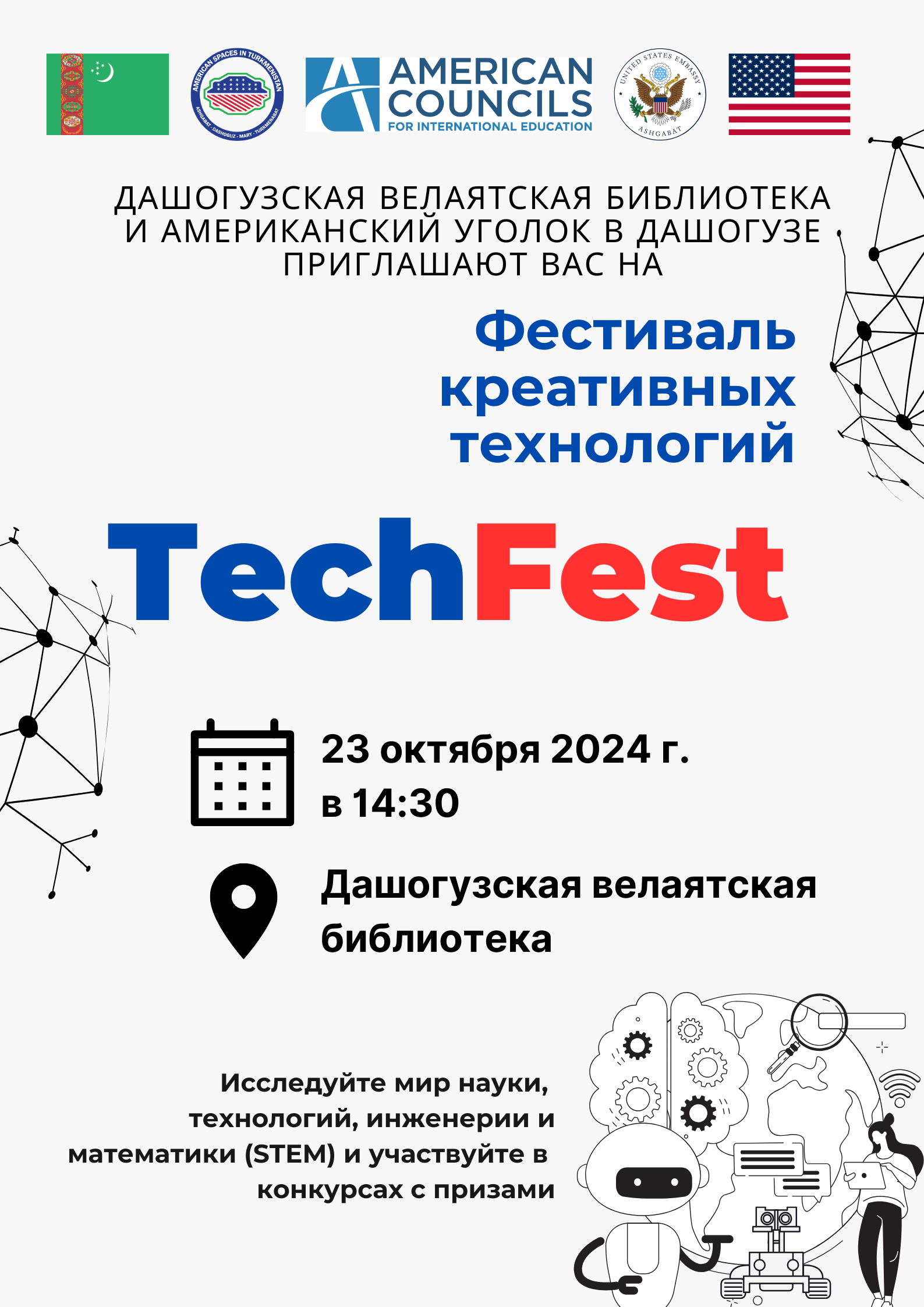 23 октября в региональной библиотеке города Дашогуза состоится Технофестиваль (TechFest), посвящённый науке, технологиям, инженерии и математике (STEM-образованию).