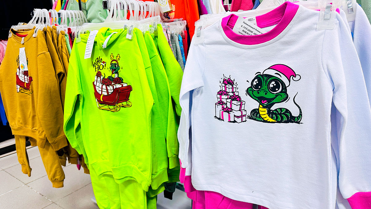 Внимание привлекают также детские пижамы с нагрудным изображением милашки-змеи.