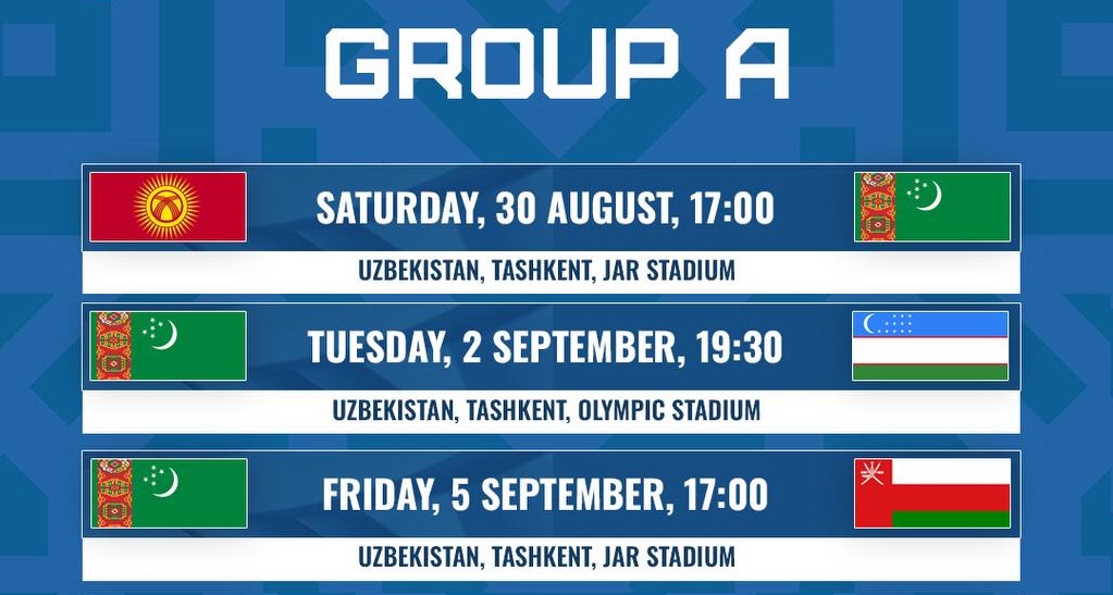 Главный тренер сборной Туркменистана по футболу Ровшан Мередов объявил список футболистов, вызванных на предстоящие матчи национальной команды в Кубке наций CAFA. В субботу, 30 августа, Туркменистан сыграет с Кыргызстаном. Во вторник, 2 сентября, встретится с Узбекистаном, а в пятницу, 5 сентября – с Оманом.