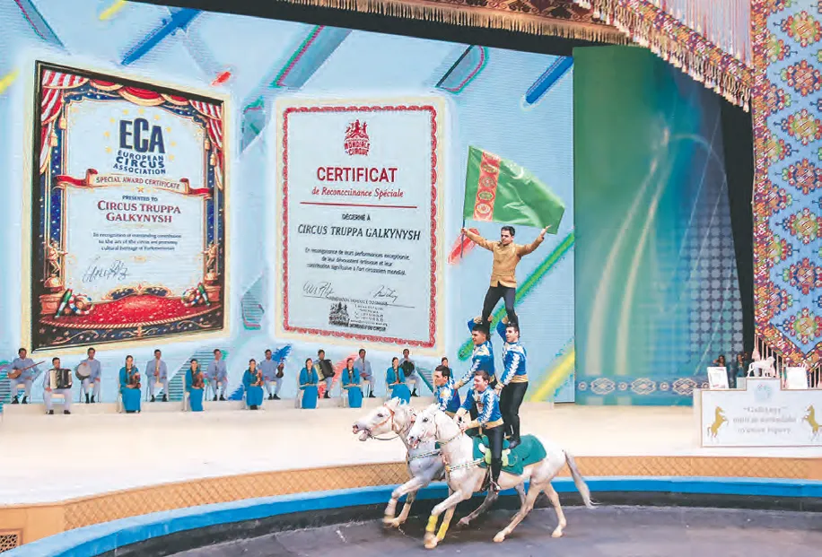 – Выступления нашей Группы всегда ждут с нетерпением, – говорит художественный руководитель Группы национальных конных игр «Galkynyş» заслуженный коневод Туркменистана Сердар Пыгыев. – Примечательно, что всё это происходит в году, девиз которого «Независимый нейтральный Туркменистан – родина целеустремлённых крылатыхскакунов». Цель нашего творческого коллектива – укрепить достигнутые нами успехи в цирковом искусстве, внести свою лепту в популяризацию ахалтекинских скакунов в мире, ознаменовать 35-ю годовщину независимости Туркменистана высокими достижениями на мировой арене.