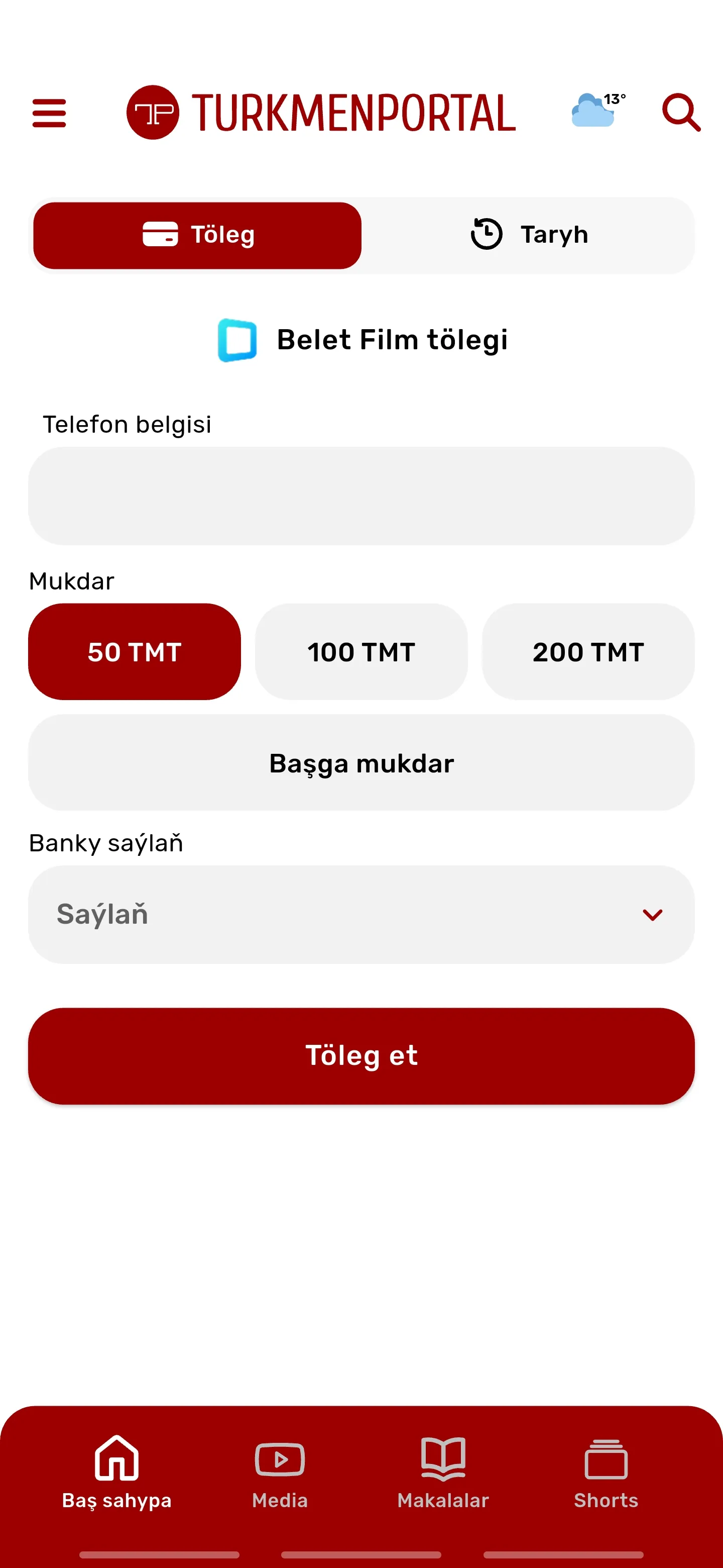 Соответствующий раздел появился в интерфейсе платформы в категории «Оплата Belet». Для совершения платежа достаточно указать номер телефона, выбрать необходимую сумму и банк для списания средств. Пользователям доступны фиксированные варианты пополнения — 50, 100 и 200 TMT, а также возможность указать другую сумму.