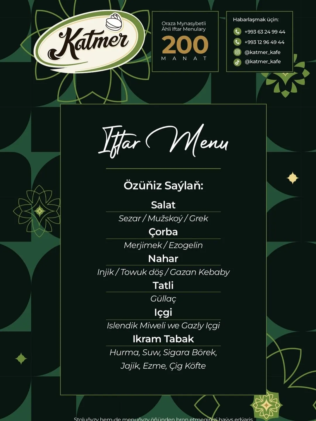 Как отмечают в кафе, оба варианта меню доступны на протяжении всего месяца Рамадан. Katmer Premium приглашает ашхабадцев и гостей столицы провести вечер разговения в комфортной атмосфере, разделив радость ифтара с семьёй и друзьями.