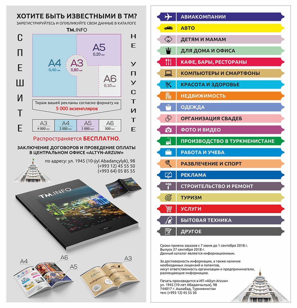 Katalog üçin hasaba alyş 2018-nji ýylyň 7-nji iýunynda başlady. Ol şu ýylyň 1-nji sentýabryna çenli dowam eder. Häzirki wagtda ýerleriň aglaba bölegi eýelendi. TM.INFO biznes katalogyny çap etmek işi 27-nji sentýabrda amala aşyrylar.
