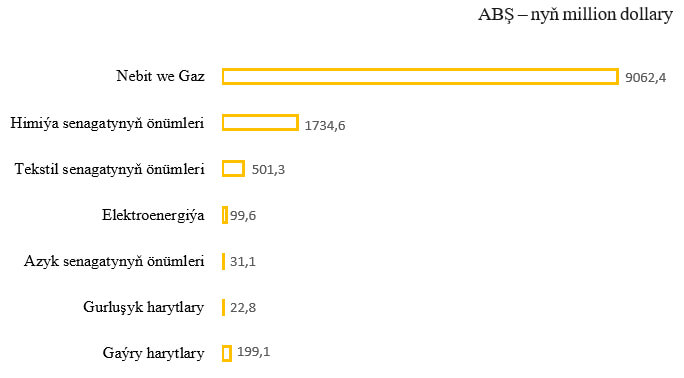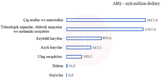 Import boýunça ilkinji 5 giren döwletler: Türkiýe, Birleşen Arap Emirlikleri, Hytaý Halk Respublikasy, Germaniýa, Russiýa Federasiýasy.