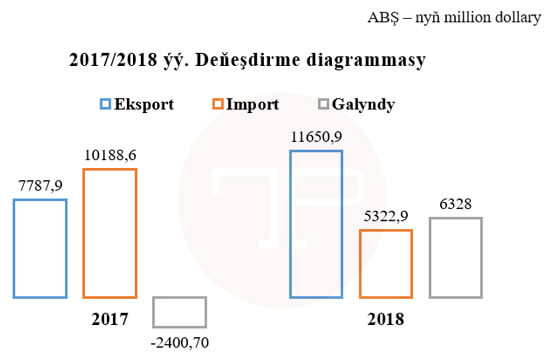 Diagrammadan görnüşi ýaly, 2018-nji ýyly geçen ýyl bilen deňeşdirsek eksportyň artandygyny, Importyň bolsa esli möçberde azalandygyny hem görmek bolar, azalma 47,80 % barabar. Importyň azalmagy, ýurtda gyzyl pullarynyň tygşytlanmasyna esas bolar.