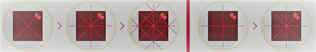 Üçburçluk nusgawy prizma görnüşli kesim. Tortuň merkezine pyçagy dürtüp, ondan aralary deň bolan göni kesimleri almak. Munda usullylyk bilen tortuň ortasyna salnan pyçagy gyralygyna kesip geçirmeli. Şeýlelikde, üçburçluk şekilinde göwrümli deň kesimleri almak bolýar.