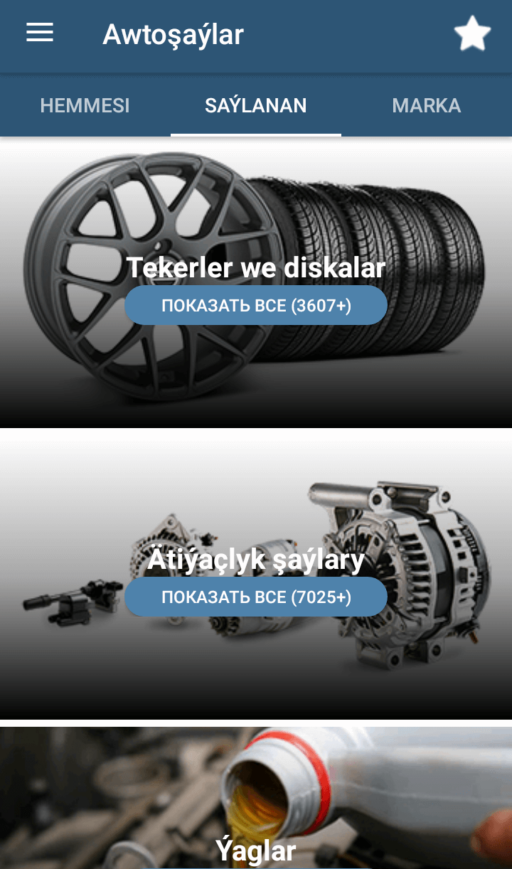 “Saýlanan” bölüminde bolsa, ulanyjylara awtoşaýlary gözlemekde amatlylyk döretmek maksady bilen, programmanyň administratorlary tarapyndan awtoşaýlar birnäçe böleklere, ýagny peýdaly gözleg filtrlerine bölünipdir. Olar: “Tekerler we diskalar”, “Ätiýaçlyk şaýlary”, “Ýaglar”, “Satylan awtoşaýlar”, “Awto gurallar” we “Aksessuarlar”. Bu filtrleriň atlarynyň aşagynda hersine degişli goýlan bildirişleriň sany hem görkezilýär. Şeýle taýýar gözleg filtrleriň bolmagy ulanyjylara zerur awtoşaýlary tiz tapmaga ýardam berýär.