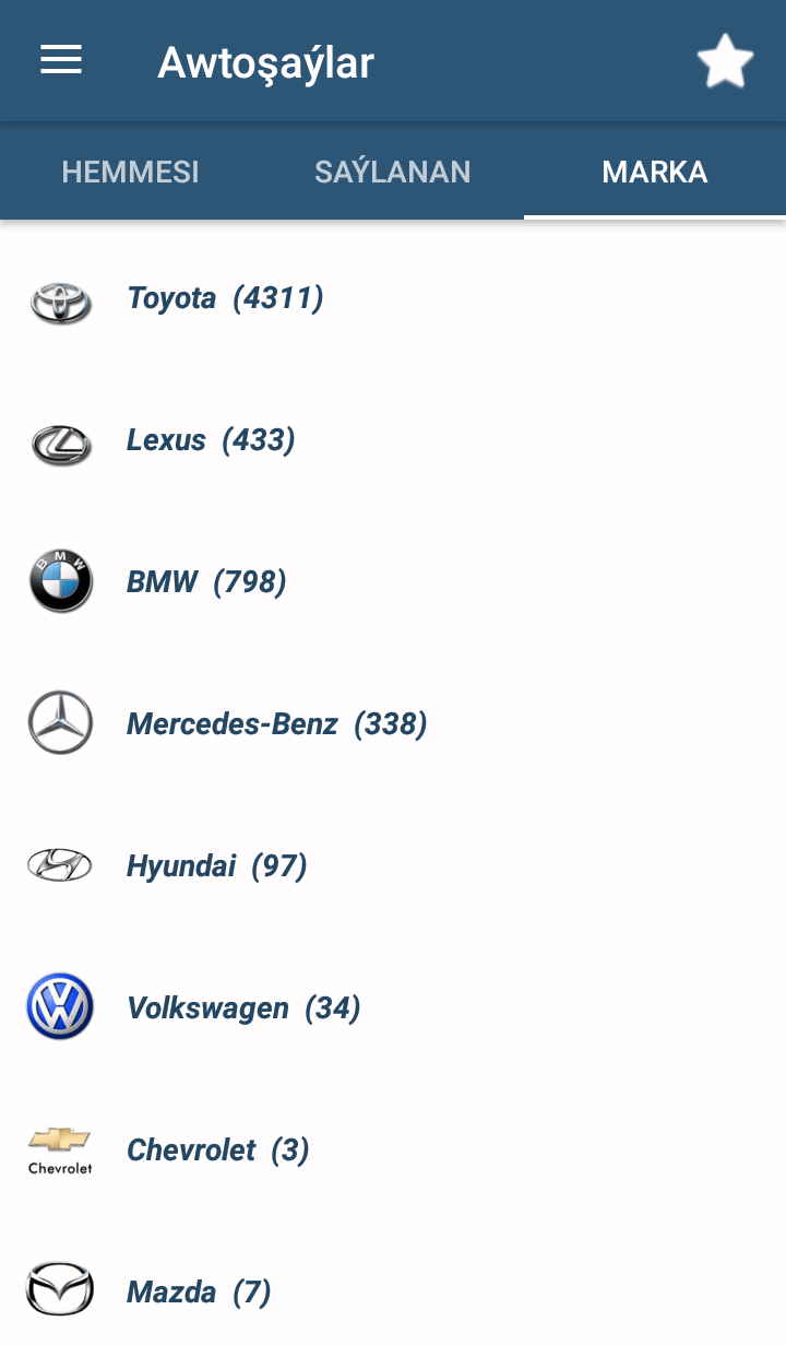 “Marka” bölüminde awtoulaglaryň markalary ýerleşdirilen we gapdalynda, ýagny ýaýda, goýlan bildiriş sanlary görkezilen. Mysal üçin, “Toyota (4311)”: “Toyota” ulagyna degişli 4311 sany satlyk awtoşaýlar bildirişleri goýlupdyr.