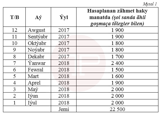 Arslan 2018-nji ýylyň awgust aýynda 30 günlük ýyllyk zähmet rugsadyny almagy meýilleşdirýär. Biz Arslanyň ortaça aýlyk zähmet hakyny we ortaça günlük zähmet hakynyň möçberi hasaplamaly. Kodeks boýunça ortaça günlük zähmet haky ortaça aýlyk zähmet hakyny 29,7-ä bölmek ýoly bilen hasaplanýar. (Mysal 1 seret)